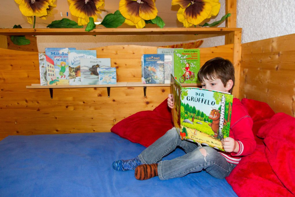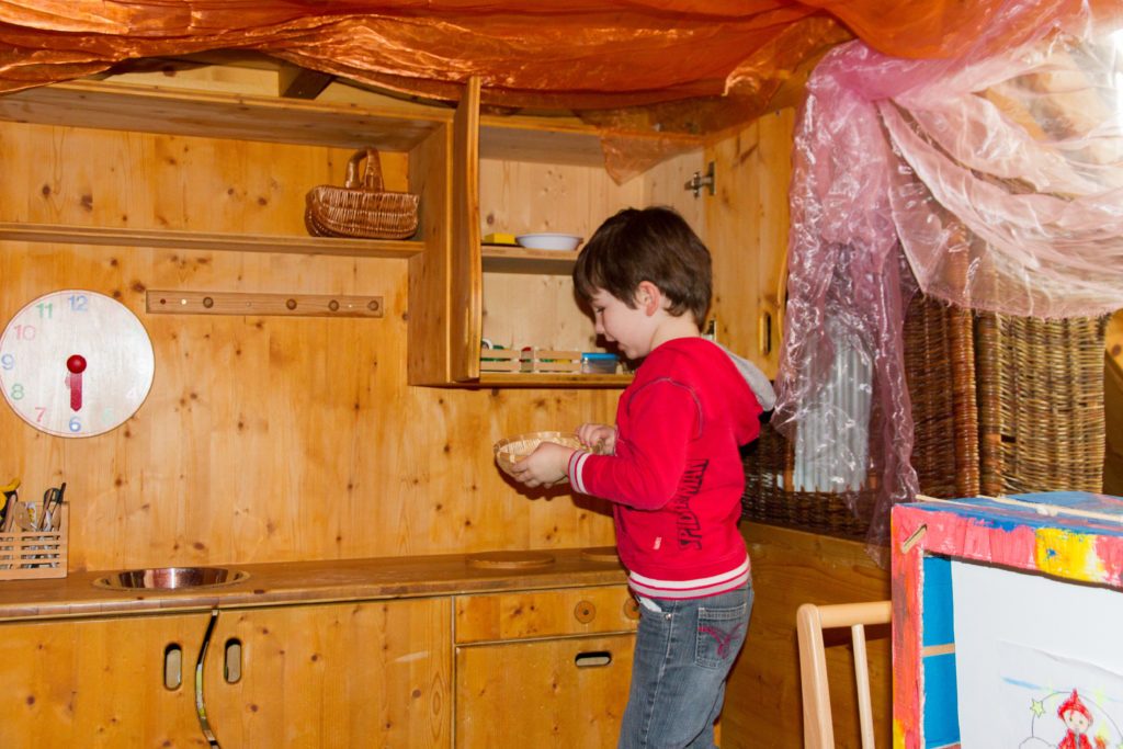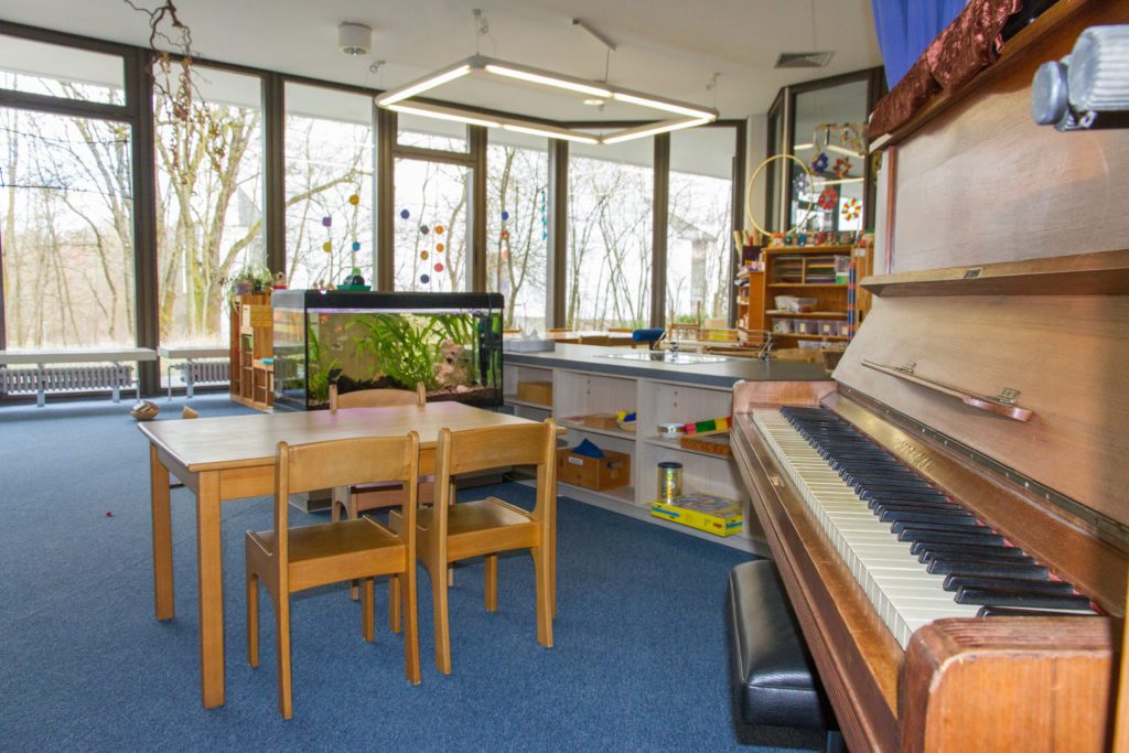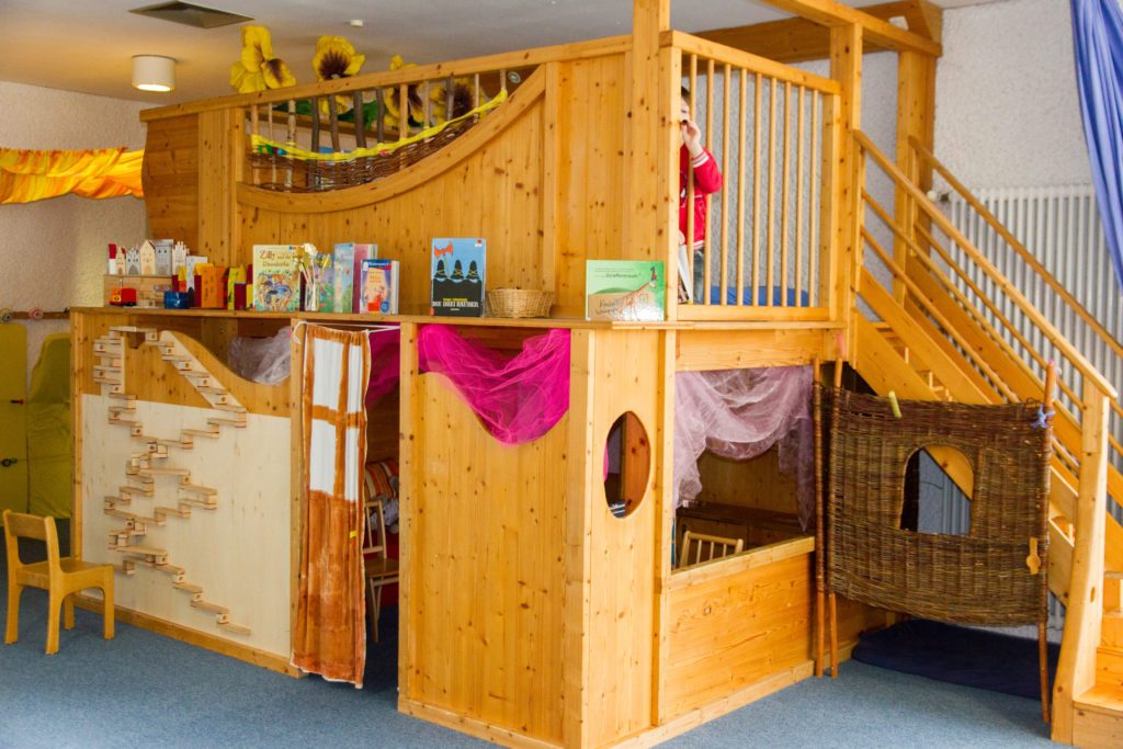 Eine Hochebene mit einer großen Liegefläche wird gerne als Vorleseinsel und Kuschelecke genutzt und bietet den Kindern Rückzugs- und Ruhemöglichkeiten. Daneben gibt es ausreichend Platz für Bastelaktivitäten sowie eine Bau- und Spielecke. Für eine entspannte Raumatmosphäre sorgt die Verwendung naturbelassener Hölzer und ruhiger Farben. Die weitgehend selbst gefertigten Dekorationen orientieren sich an den aktuellen Themen der Erzieherinnen.