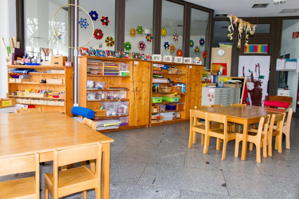 Angrenzend an die Cafeteria haben die Bärenkinder einen hellen und freundlichen Gruppenraum mit ca. 100 qm Grundfläche, der in pädagogisch sinnvolle Spielbereiche unterteilt ist.