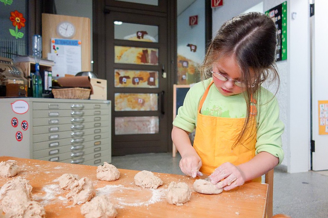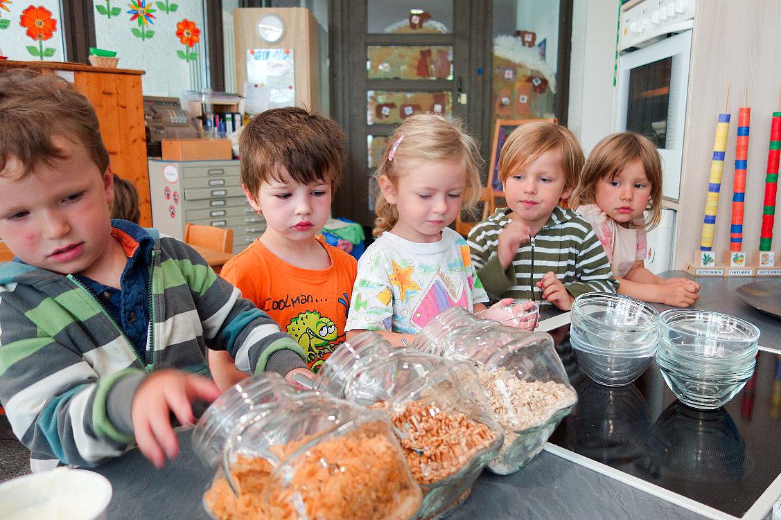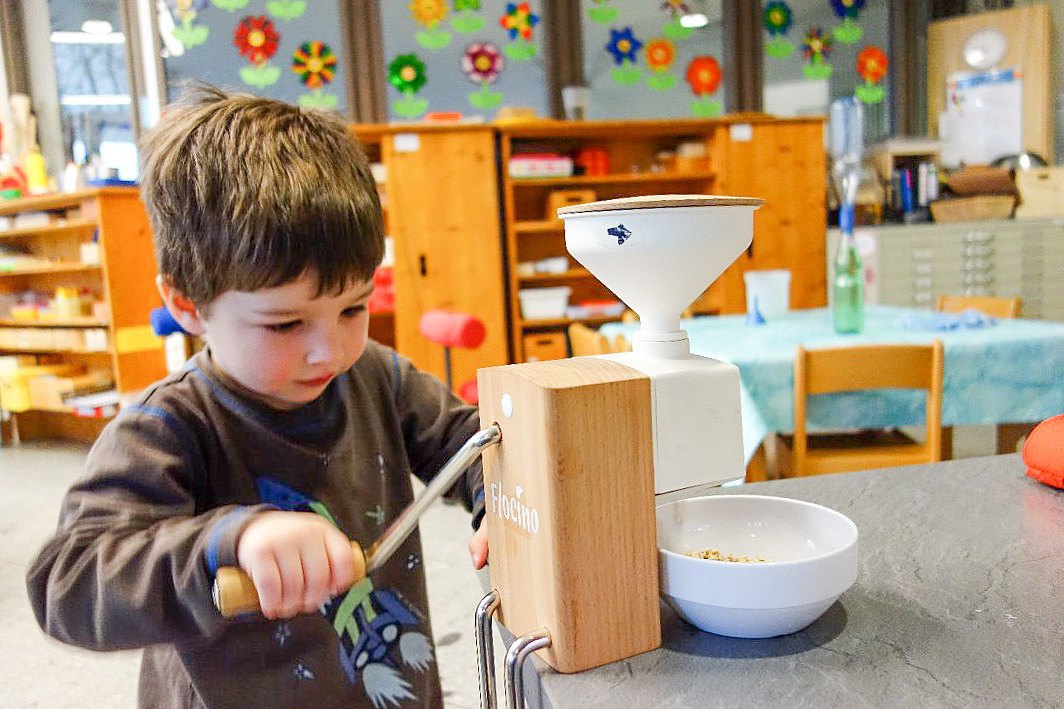 Am Montag wird unseren Kindern zur Brotzeit, die gruppenintern täglich gegen 10:30 Uhr stattfindet, Müsli angeboten. Hierzu dürfen jeweils zwei Kindern mit der Flockenpresse fleißig Hafer zu Haferflocken verarbeiten. Daneben gibt es auch andere Flakes, Nüsse, Rosinen, frisch geschnittenes, saisonabhängiges Obst, Bio-Joghurt und Bio-Frischmilch. Für den Mittagstisch backen wiederum zwei Kinder unter der Anleitung eines Erwachsenen Vollkorn-Semmeln oder -Pizza, die dann nach persönlichen Geschmack verfeinert werden können. Hierfür stehen u.a. verschiedenen Käsesorten, von den Eltern selbsteingekochte Marmeladen oder vom Kindergarten selbst geimkerter Honig zur Auswahl.